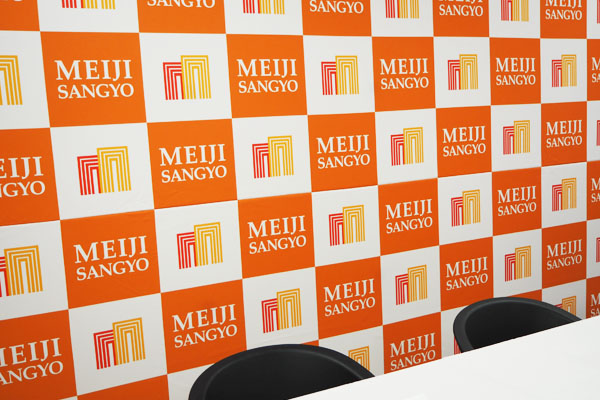 定番の市松柄に企業ロゴと企業名がプリントされたバックパネルは背景装飾として活躍しています。
