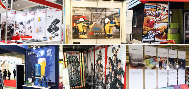 特に新商品の写真をフルカラー印刷した特注タペストリーは、来場者に注目されます。
