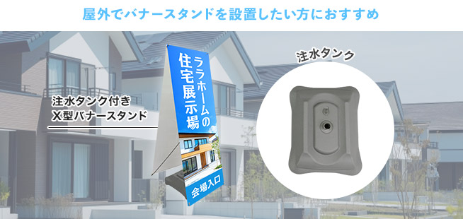 バナースタンドのほとんどが屋内使用にのみ対応しているものばかりですが、当店には屋外設置に対応できる注水タンク付きのX型バナースタンドも販売しています。