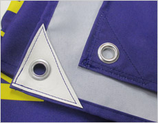 先ほど、ご紹介させて頂いたのは特注にて作成された応援幕がハトメの部分から裂けないように、耐久性を挙げる加工になり、こちらでは周囲から解れにくくする補強方法をご紹介させて頂きます。