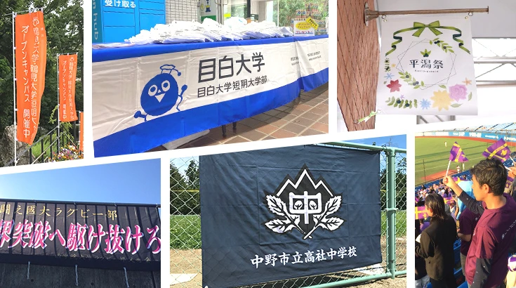 当店ではこれまでに、文化祭・学園祭装飾や部活の大会応援、学校説明会・相談会と、学校行事向けの様々なオリジナル旗やオーダーメイド幕を特注制作してきました。