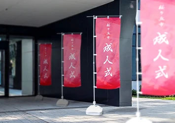 成人式や啓発イベントを含む地域主催の式典では、幅広い参加者に向けた分かりやすい会場装飾が求められます。会場正面には式典名を印刷したオリジナルの横断幕を設置し、周囲にはのぼり旗を複数枚配置することで会場へ誘導できます。