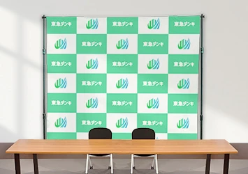 企業ロゴを名入れデザインしたテーブルクロスは会議机に掛けるだけで設置完了。壁面や仕切りパネルを使用できる場合はタペストリーが人気です。