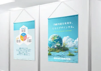学校法人様の合同説明会の場合は校舎の雰囲気が伝わるような写真、企業様の展示会出展の場合ですと商品写真やブランドキャラクターなど、どのようなデザインも鮮やかにオリジナル印刷いたします。