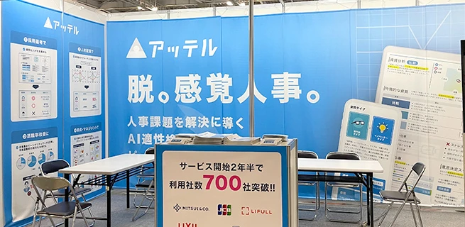 展示会ブースでは、「遠くからでも視認できる大きなツール」と「ブース前で足を止めた方に情報を伝えるツール」をバランスよく配置することが重要です。