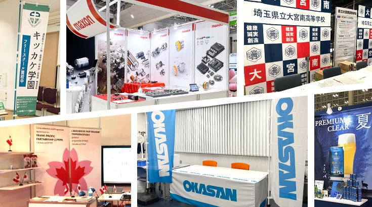 展示会や説明会に出展する際、各企業様・学校法人様には小間ブースが割り当てられますオリジナルデザインプリントを行った販促ツールをブース内に設置することで、集客効果の高いPRが行えます。