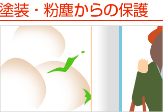 建築幕は工事現場や建築現場の作業中に発生する粉塵や破片が、周囲に舞うのを防いでくれます。同時に塗装作業ではペンキが飛び散るのを防いでくれます。
